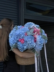 Блакитні гортензії у поєднанні з кущовою трояндою (709854)